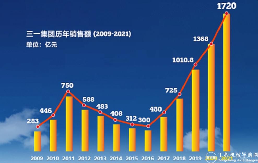 不断刷新的业绩报表,是三一这十年发展成绩的最好概述。2012年,三一集团销售额为580亿元。2019年,三一集团销售额突破1000亿元,成为国内首家“破千亿”的行业企业。2021年,集团销售额突破1720亿元,十年间增长近三倍,取得历史最好经营业绩。